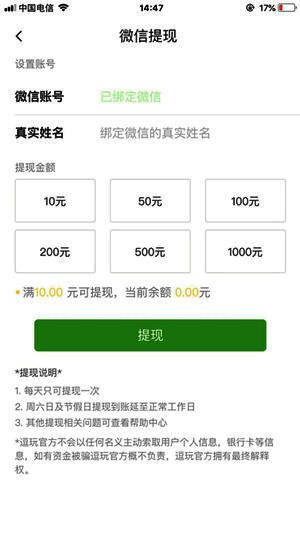 逗玩的另一个亮点是提现门槛极低,只需累计收益达到10元即可申请提现,微信钱包到账迅速,通常1-3个工作日内便可收到。此外,每天下午4点平台还会推出大量新任务,确保用户始终有新鲜内容可做,持续获得收益。