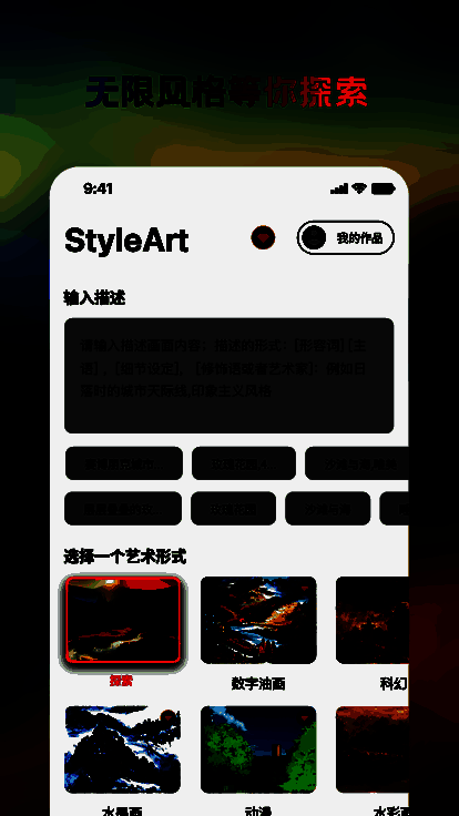 StyleArt苹果版主打“一键生成”理念,无需复杂设置即可开启你的艺术之旅。用户只需描述心中所想的画面内容,软件便能在短时间内将其转化为真实可感的图像作品,极大地降低了绘画门槛,让每位用户都能成为创作者。