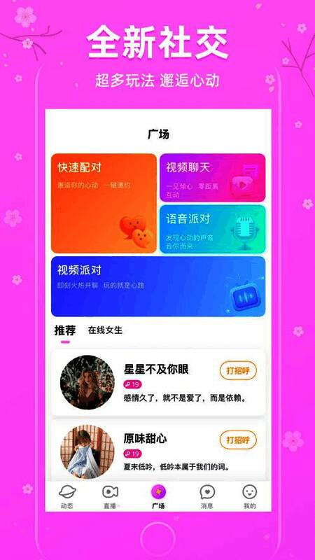 作为一款集视频语音交友、同城约会、社区互动于一体的新型社交工具,《樱花聊天》致力于帮助单身青年更自然地建立联系,拓展社交圈层,助力更多人实现从“陌生人”到“好朋友”甚至“另一半”的转变。