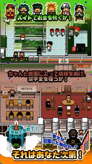 游戏采用了经典的日系像素美术风格,营造出轻松却不失代入感的氛围。通过“去学校”与“打工”两种核心行为模式,玩家可以在学习与工作中找到平衡点,从而实现理想的人生目标。