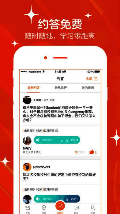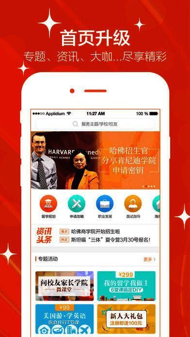 平台设有“约答”板块,用户可以自由提问并获得来自精英校友的专业解答;“资讯头条”则每日更新最新留学动态与海外生活信息;更有“课程专题”提供DIY留学技巧与实用英语课程;同时还有“一对一咨询”和“校友直播间”,让用户随时与导师沟通,参与大咖访谈。
