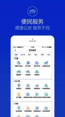 在交管方面,软件支持交通违法自助处理与缴费、便捷挪车、掌上车管等操作;出入境服务则包括港澳再次签注、预约填表、电子支付等功能;治安服务涵盖身份证进度查询、流动人口登记、身份验证以及防诈骗提醒等内容;此外还提供消防、监管、综合类等多种便民服务。