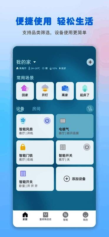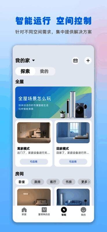 创新性的"探索"板块每日推荐精选场景方案,如睡眠模式自动调暗灯光、晨起模式渐开窗帘等。配合24小时天气预报功能,更能实现根据气候自动调节室内环境的智能化操作。