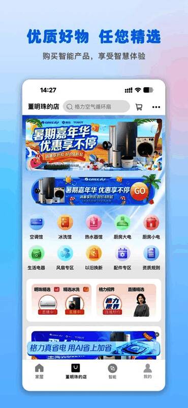 除了基础的设备控制功能,格力+还打造了完整的智慧生活闭环。内置商城提供全品类格力产品选购服务,从家用空调到厨房电器应有尽有。特别设置的"董明珠的店"专区,带来官方直供的品质保障和专属优惠。