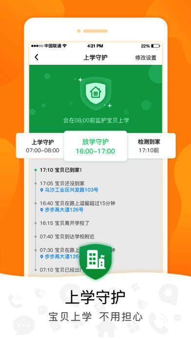 9、上学守护:利用定位技术追踪孩子上下学路线,主动向家长报告到校、离校及回家时间,防止迟到或逗留情况发生;