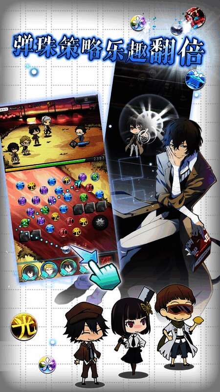 游戏采用创新的拖曳弹射操作方式,结合每位角色独特的异能技能,如「月下兽」、「人间失格」、「罗生门」等,打造富有策略性的战斗系统。玩家需要精准控制弹珠轨迹,并在关键时刻发动技能,才能击败强敌,赢得胜利。