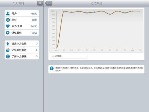 应用内设有详细的学习数据统计功能,可记录总背诵时间、复习时长及真实词汇量(去除重复与词组)。用户可清晰看到自己投入的时间与词汇增长情况,例如“48小时背诵="3000词汇”。此外,系统还会自动生成艾宾浩斯记忆曲线图表,让用户直观了解自己的记忆保持率,如“复习6次后,一个月前背诵的单词记忆率仍达90%以上”。<"/p>