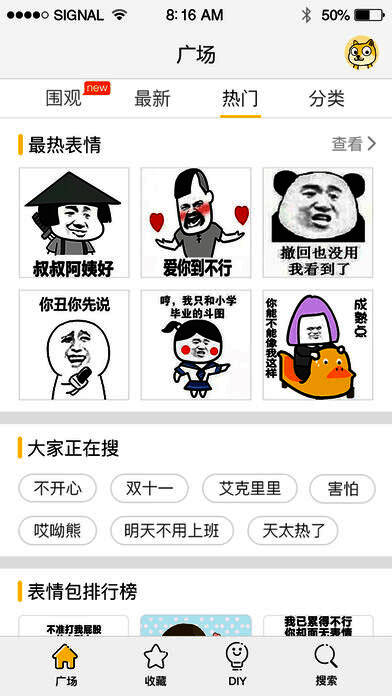 除了庞大的表情库之外,《表情广场》还具备多项实用功能:无广告干扰、永久免费使用;支持QQ、微信、Line等多种社交平台;独创的微信表情键盘功能让聊天更加随心所欲,随时随地开启趣味吐槽模式。