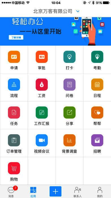 《万客》提供了18项核心功能模块,涵盖从消息通知到招聘管理的全流程支持。例如“消息”模块提供企业社交平台,确保待办事项及时提醒;“申请”与“审批”模块则将传统纸质流程电子化,提升内部效率;而“打卡”与“考勤”功能则让员工轻松掌握自身出勤状况。