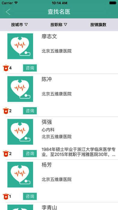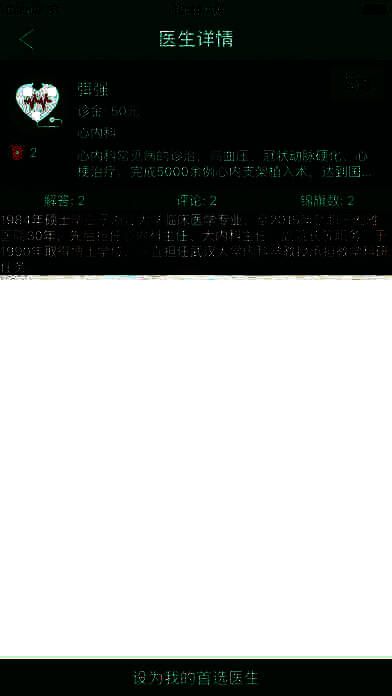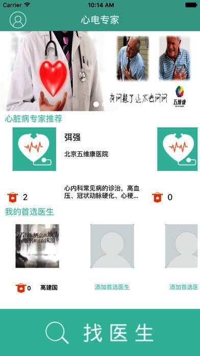 1、App主界面有专家推荐模块和首选医生模块。用户通过专家推荐可快速找到心仪的医生。用户已选择的主治医生则会出现在首选医生模块。另外用户还可通过找医生功能,更详细全面的寻找自己心仪的医生进行咨询。专家推荐会优先选择即时在线的医生,当没有在线医生时则会不推荐医生;