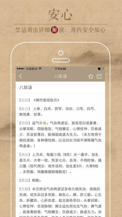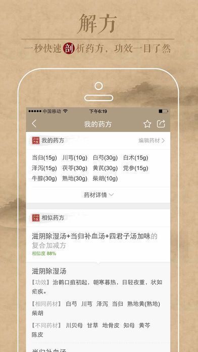 6、【在线解读】:随时随地查询、收藏药方,手到擒来。