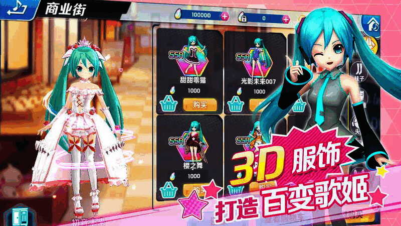 《初音速》中将会有经由Crypton Future Media公司监修过的海量精美服饰,无论是帅气的殿下装,精致的和服装,可爱的猫咪装,璀璨的冰雪公主装,初音未来的衣橱完全由玩家打造。