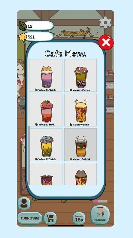 3.如果你-直得到金币,你可以去商场买桌椅等家具来装饰你的奶茶店;
