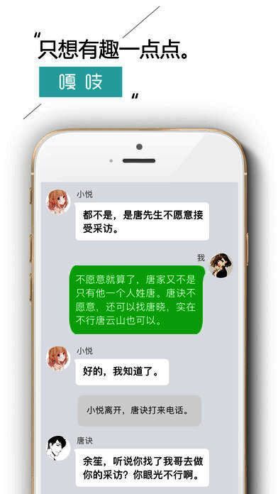 嘎吱app为用户展现一种全新、有趣的小说形式,嘎吱app通过对话的方式为你展现小说内容,嘎吱app这样创新的方式让你更有兴趣去阅读,同时也能更想阅读,欢迎下载嘎吱app使用体验。