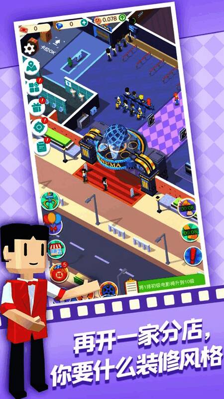 我爱看电影游戏下载这款游戏采用了 2D卡通作为核心画风。在这款游戏中玩家将拥有一座属于自己的电影院,你需要做的就是通过引流揽客增加影院的经济收入,并且扩建自己的电影院,直到升级成连锁影院,游戏还支持一键放置解放双手。