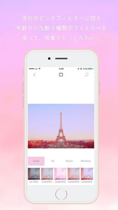 把照片更加甜美,可爱,鲜艳的照相机应用程序!用照相机、照片上的时候加入了不同颜色鲜艳的滤镜,非常甜美的照片!喜欢梦想可爱的女子,女生当然也喜欢照片男子也推荐的过滤器!人气的粉红过滤器一推。