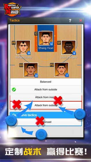 3、战术设置:老鹰进攻、三角进攻、外线投篮、强攻内线、全场紧逼、盯人内线、2-1-2联防...等;