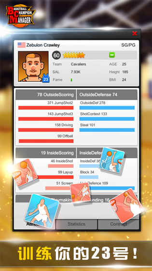 玩家还可以在游戏内部通过职业生涯联赛、训练中心、竞技大厅等多样比赛获得许多顶尖的NBA、CBA球员,可以通过自己的努力打造一支专属于自己的全明星梦之队。