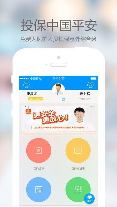 上门康复是中国中医集团为医生、护士、康复师量身定制的移动医疗平台,我们为每一位上门服务的医护人员都购买了中国平安的保险,保障每一位医护人员的切身利益。
