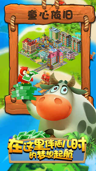 这款游戏画面清新自然,融合了城市建筑和乡村风光的游戏画面使玩家心情舒畅。这款游戏的操作非常简单,在游戏开始时,会有动画操作演示,玩家开始时可以随着动画操作进行庄稼种植,建造房屋的建筑,农副产品的生产等,还能用直升机将产品运往居民住处,就可以完成订单。游戏中玩家在完成一个新的建筑物的建造以及生产、收获农副产品等都能够获得经验,可以用于玩家的升级,升级后玩家能获得新种类的物品、金币以及绿钞。