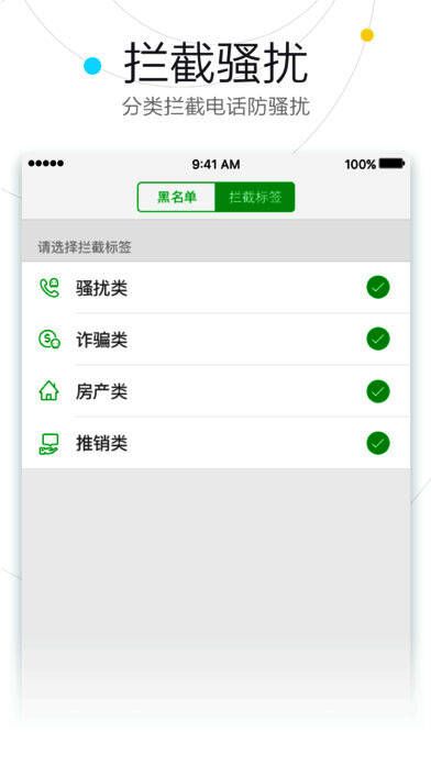 拦截骚扰电话:支持黑名单管理,分类拦截骚扰电话。