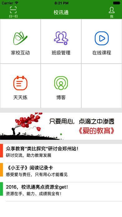 校讯通APP是基于互联网、3G网、移动终端的一款实现家庭与学校快捷、实时沟通的APP平台。校讯通APP是一套高效发布校园信息,有效解决老师和家长之间沟通,帮助孩子健康成长的信息交流系统。针对幼儿园及小学教育阶段的学生而开发,他可以让家长每天都能收到孩子当天的学习内容,作业等,了解到孩子在学校的情况,也可让家长随时、随地的与老师沟通提出建议或反映孩子在家里的表现。他充分调动社会教育资源,利用现代信息技术架起学校、家庭之间实时、快捷、有效沟通的桥梁,形成社会、学校、家庭和谐共育的局面,促进学生健康成长。
