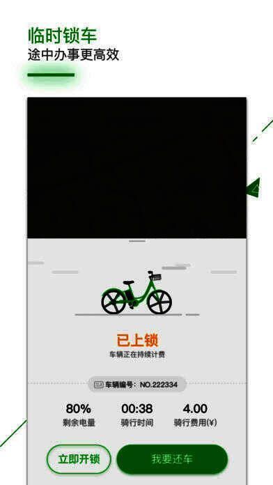 4、关锁即还,方便快捷。停车后手动合上车锁,即完成还车,结束计费;