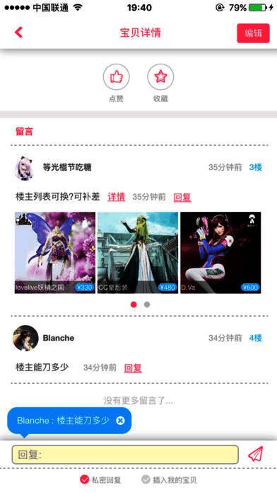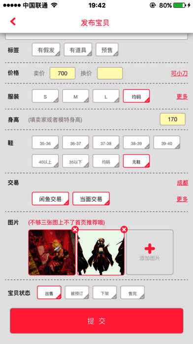 2、贴心打造聚集90万件宝贝信息的cos交易集市,自动推送买家、自动匹配交换双方,助力每一个喜欢cosplay的聚聚轻松玩转;CP、摄影、妆娘、服装、道具、活动社团,还有一座cosplay的匠人之城等你发现;