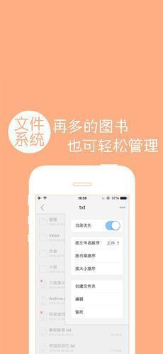 按目录方式管理图书文件,在目录中可进行搜索(可用关键词,拼音或首字母快速检索)、排序(可按文件名,大小,时间进行排序)、复制、移动、删除、新建文件夹、重命名、发送邮件(把选中的文件通过邮件发送)、OpenIn(通过其他应用打开选中的文件)、压缩文件和文件夹(把选中的文件和文件夹压缩成zip文件);