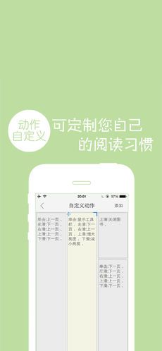 可以在屏幕的任何区域设置单指和双指的单击、左滑、右滑、上滑、下滑动作。动作类别包括上一页、下一页、增大字体、减小字体、增大亮度、减小亮度、显示工具栏、添加或删除书签、打开目录列表、打开备注页、打开文本搜索页、打开解释收藏页、打开系统配置页、关闭图书、自动阅读、语音阅读;
