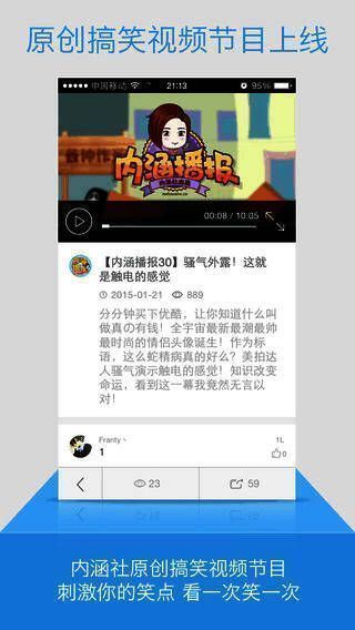 内涵社是一个毫无节操的搞笑图分享社区,在这里每天都能产生成千上万的段子,各种最新内涵图片、小视频等等,每天有超过500万的用户观看。在这里大家可发现生活中很多形形色色的搞笑内涵片刻,与别人一起分享。