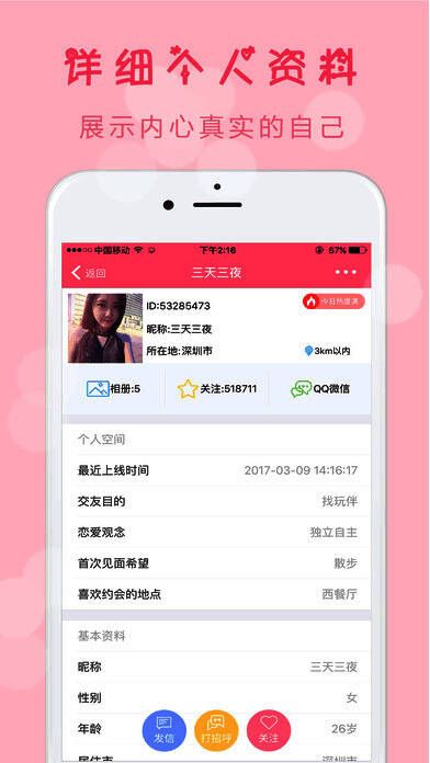 3、注册会员可查看对方的年龄、身高、体型、学历、职业、收入、兴趣、相册、自我介绍文等个人详细资料,非常方便你寻找心仪的对象;