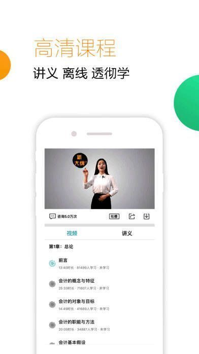 1、百位会计名师同时开讲:预习班、基础班、习题班、精讲班、串讲班等完美班次搭配,满足你会计从业、注会、会计职称等学习任何阶段需要,可同时观看讲义、调语速、做笔记、音/视频切换,还能下载本地哦;
