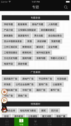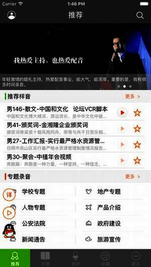 深度配音云集各地知名配音师,为您提供海量的样音在线试听,覆盖广告片、专题片、纪录片、影视剧、外语等各类配音专题。您可以方便地收藏喜欢的配音老师和样音,满足您配音以及学习的需要。