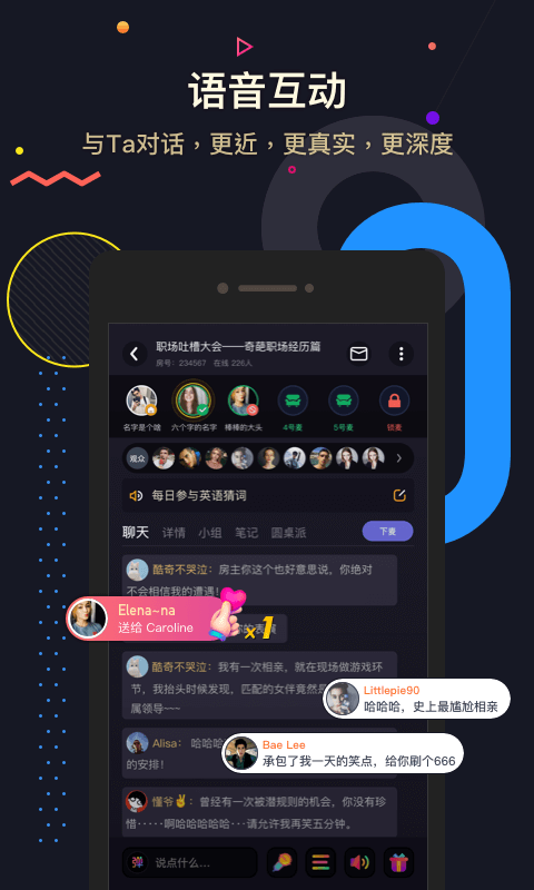 1、语音房功能,在此可以创建房间,多人在线进行英语口语交流;