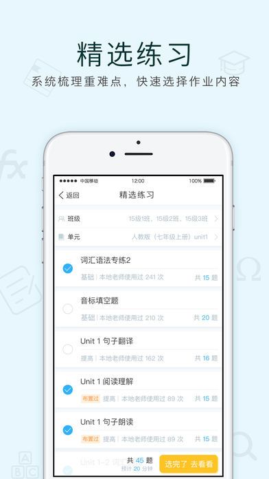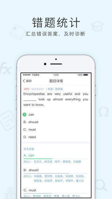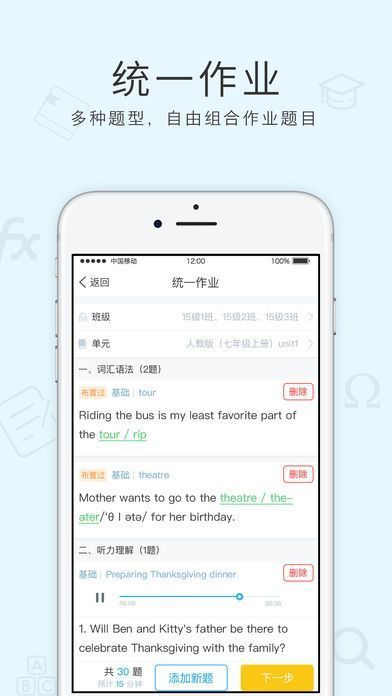 老师可以在手机或电脑上将我们准备的精选练习布置为作业,自由组合作业内容,适合不同程度的学生水平。学生完成作业后,系统自动批改,并要求学生进行错题订正。实时产生成绩分析报告,让老师可以及时掌握学生的完成情况,了解薄弱知识点,大幅减少工作量。