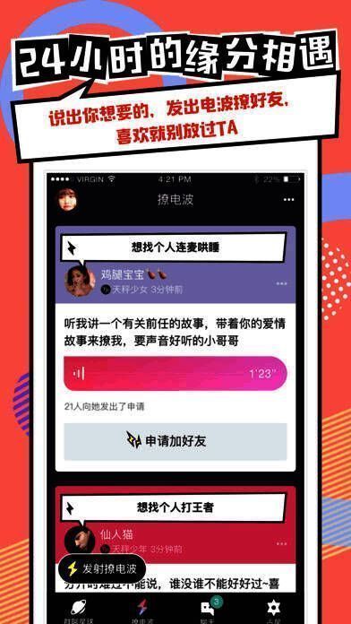 发出电波,相当于开启邀请好友申请的通道!24小时有效,让更多有趣的人看到你!无聊的碎片时间,到撩星系回应别人的电波,认识更多有趣的朋友;
