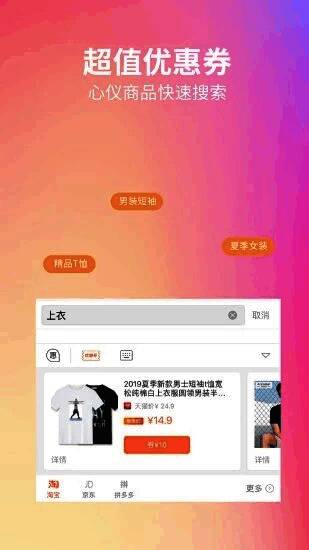 『方便搜券』键盘上直接搜索就能拿到淘宝,京东,拼多多等各大商店打折优惠券,方便多多。