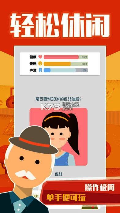 《大爷模拟器》游戏操作十分简单,只需用拇指向左或向右划动卡牌,以做出不同的选择,推动故事发展。不过请留意您的属性值,当属性值为零时,游戏便告结束。《大爷模拟器》极易上手,休闲有趣,但却充满挑战。