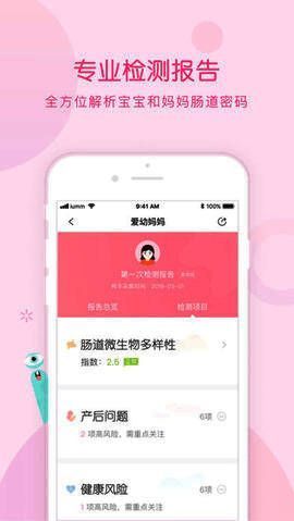爱幼妈妈app主要为各位妈妈们服务的,你可以通过爱幼妈妈app独家提供的肠道微生物母婴共同检测服务为宝宝进行身体检查,并且还有专业的宝宝健康管理方案为你提供,做到真正预防疾病。
