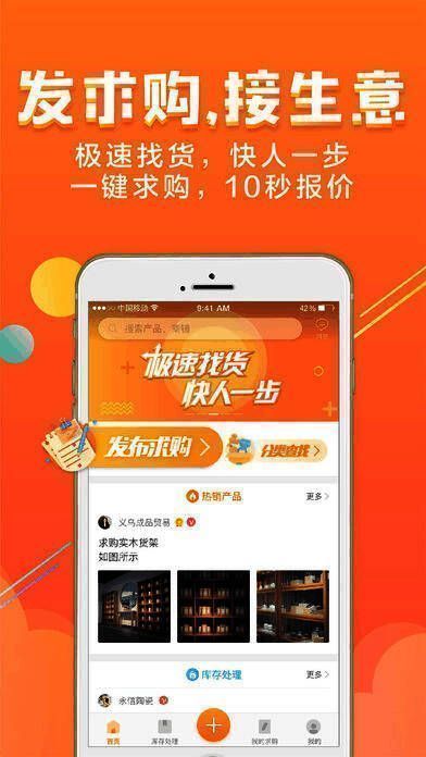 1、发求购,接生意-极速找货,快人一步;10秒报价,一键求购;
