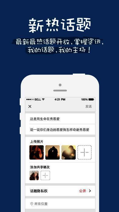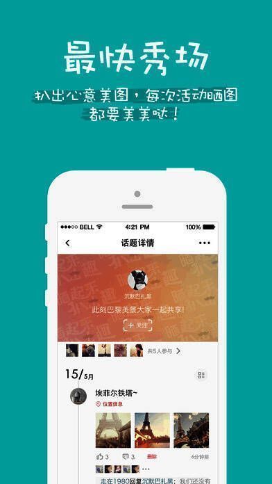 2、一键创建晒我的地盘我做主,发掘话题、结伴而游、度蜜月、宝宝成长、家庭日等甜蜜激情难忘时刻随时与好友共享美图,邀请好友一起留下瞬间,好友任意加,多种权限随意设置。