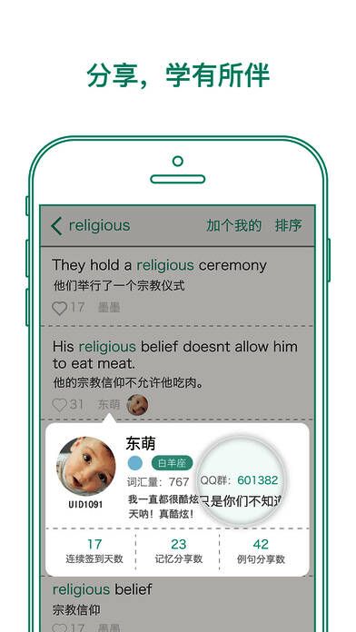 墨墨背单词的例句和助记都可以自定义,你可以查看其他人的炫酷分享,会不会为他/她的才华与坚持怦然心动?给他/她发个搭讪吧!或者加入到他/她的QQ群,一起沟通学习中的点点滴滴。