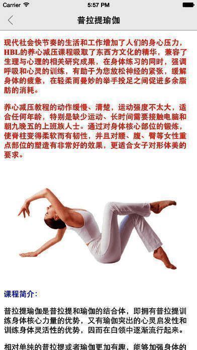普拉提系列课程吸取了东西方文化,结合不同运动方式进行健美训练、体操等各类运动,兼容了生理和心理的相关研究成果,运用自身体重、多次数、小重量以及冥想的运动原则,通过对身体核心部位的锻炼,使脊柱变得柔软而有韧性;