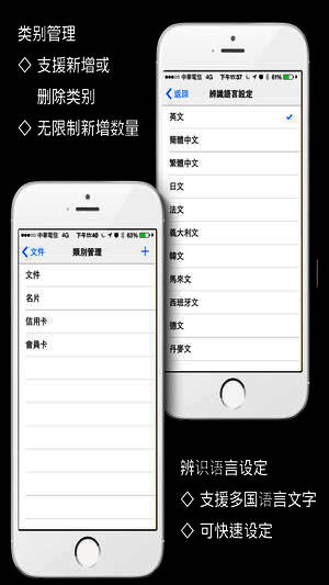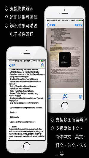 提供多国语言文字辨识功能,包含繁体中文、简体中文、英文、韩文、日文、义大利文、西班牙文、德文、法文、马来文、丹麦文...等等。