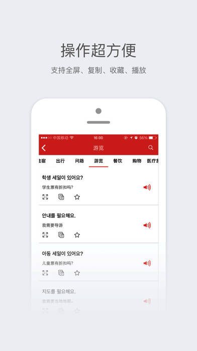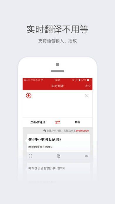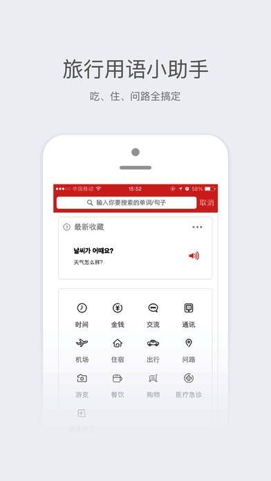 《旅游韩语翻译》地道常用语、离线使用、语音播放、实时语音翻译。消除一切语言障碍,旅行途中无忧交流,轻松玩转韩国;涵盖各种旅游中的应用场景。出行、住宿、购物等等一应俱全,还有韩国当地的城市景点、饮食文化、娱乐购物等地道信息。