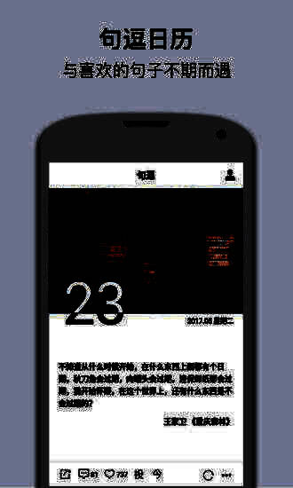 精简的交互操作,简洁大方的UI设计,我们重新定义了句子应用。在这里只有句子,严肃的句子,励志的句子,唯美的句子,心动的句子,伤感的句子,愿你每天能遇到一句让你赏心的话,一幅悦目的图,更愿你因此天天有个好心情。