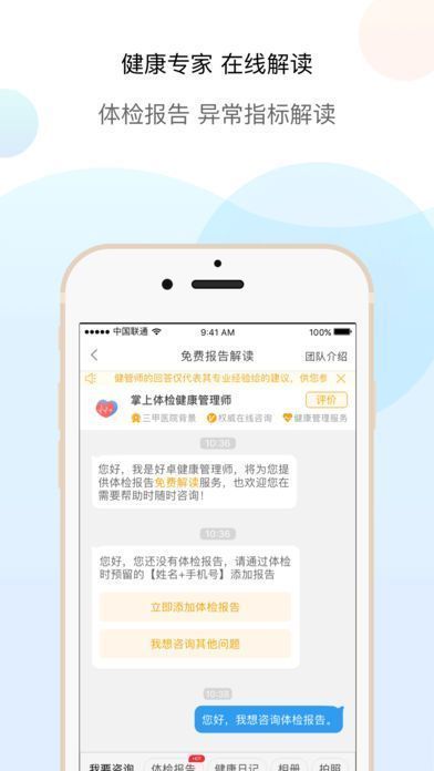 2、报告解读:医院健康管理专家免费在线解读报告;