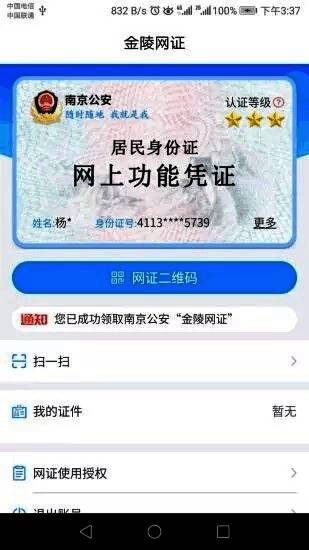 1、是居民身份证网上功能凭证(CTID),经公安部互联网+可信身份认证服务平台认证后,由南京市公安局颁发。