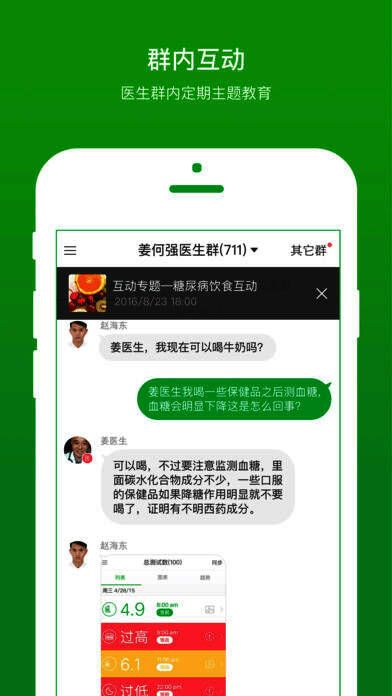 3、群互动:以医生群为核心,每周1小时的周主题互动,患者结合主题根据自身提问,医生解答患者疑问,并对血糖报告进行指导。